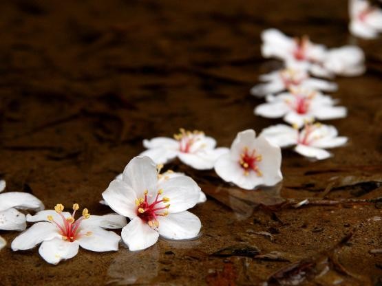 點綴在水面的油桐花,