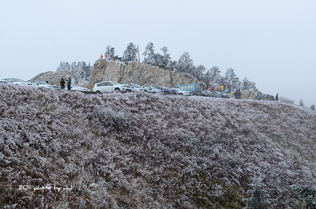 樹梢被霧淞覆蓋,成了一棵棵白頭的聖誕樹。