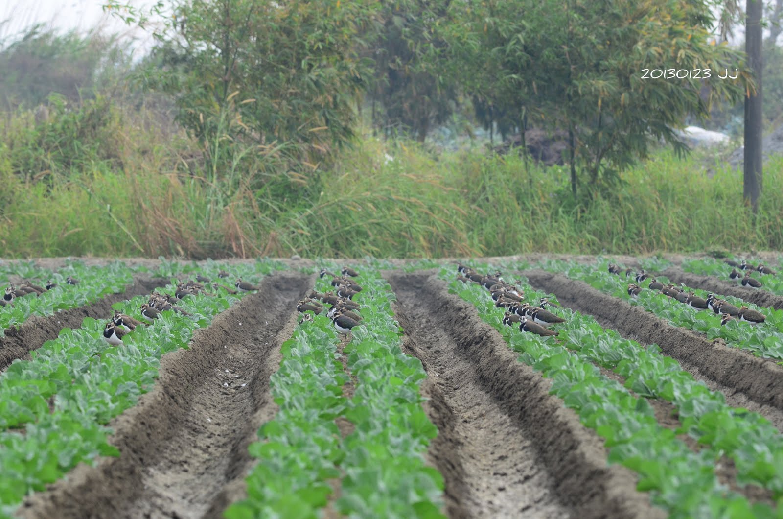 鳥群降落在鄰近採收後的花生田,距離稍微近了些,