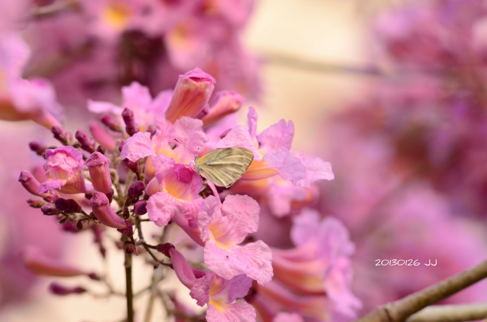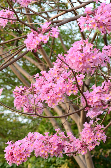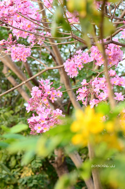 洋紅風鈴木的粉紅花,搭配鐵刀木的綠葉和黃花,