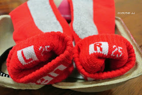不同於平常的包裝,兩隻襪子還用一條束帶包著,