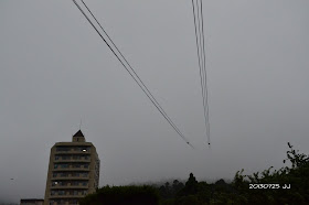 從纜車站往山頂看,纜線消失在雲霧之中,