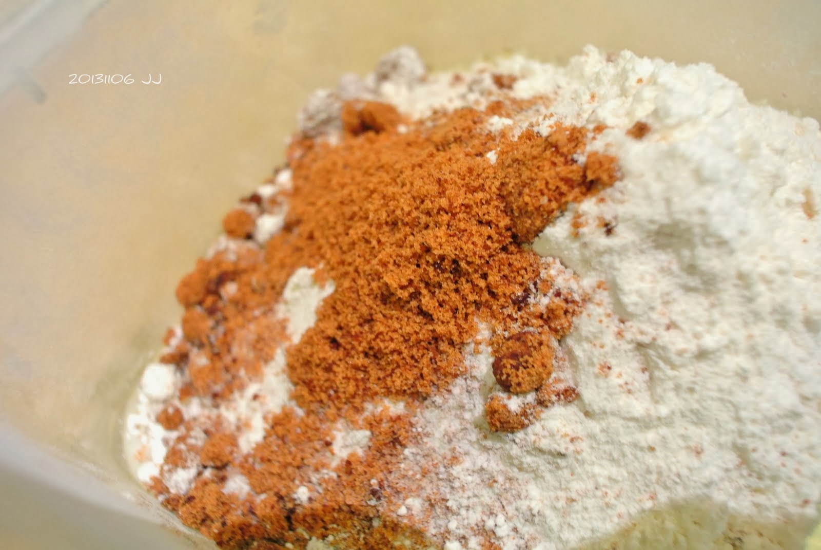 在麵粉中加入少量的塩、黑糖、奶粉。