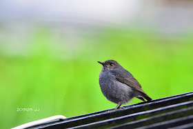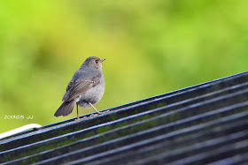 一隻鉛色水鶇雌鳥,不太怕人地佇立在涼亭屋頂,