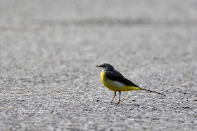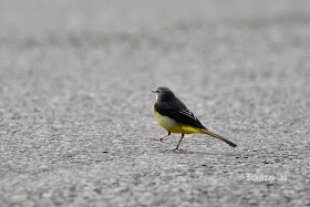 一隻白眉黃鶺鴒踏著小碎步,在路面吃早餐。