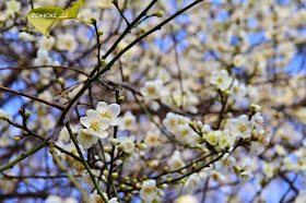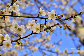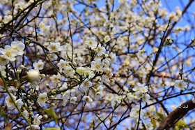 步行一百公尺就能欣賞枝頭上雪白的朵朵白梅。