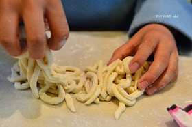 姐姐熱心地幫忙做晚餐的麵條,玩得可開心了。