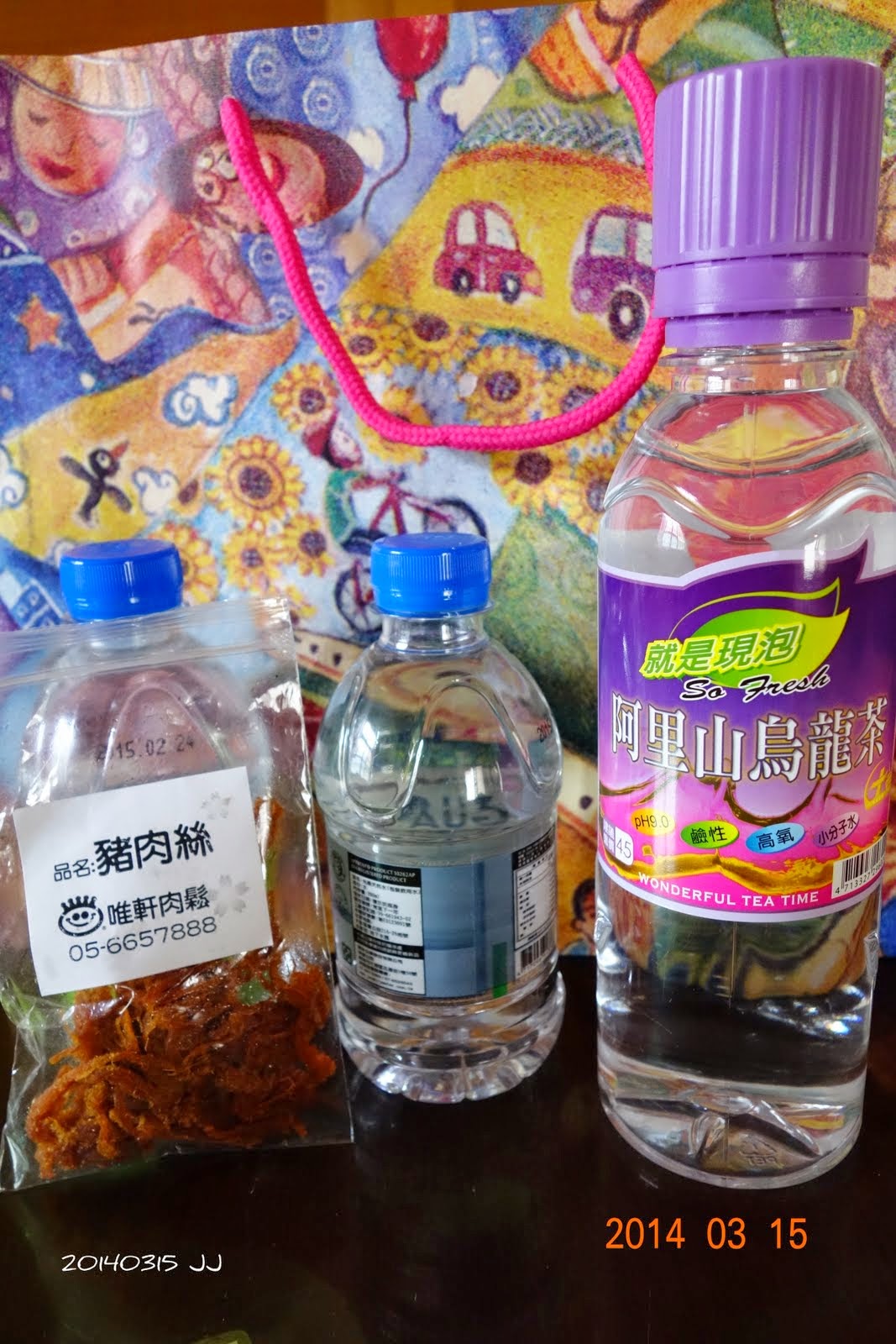 袋子裡有紀念衫、烏龍茶、礦泉水,