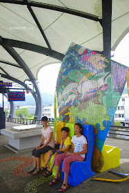 三個寶貝開心地在月台上玩跳拍。