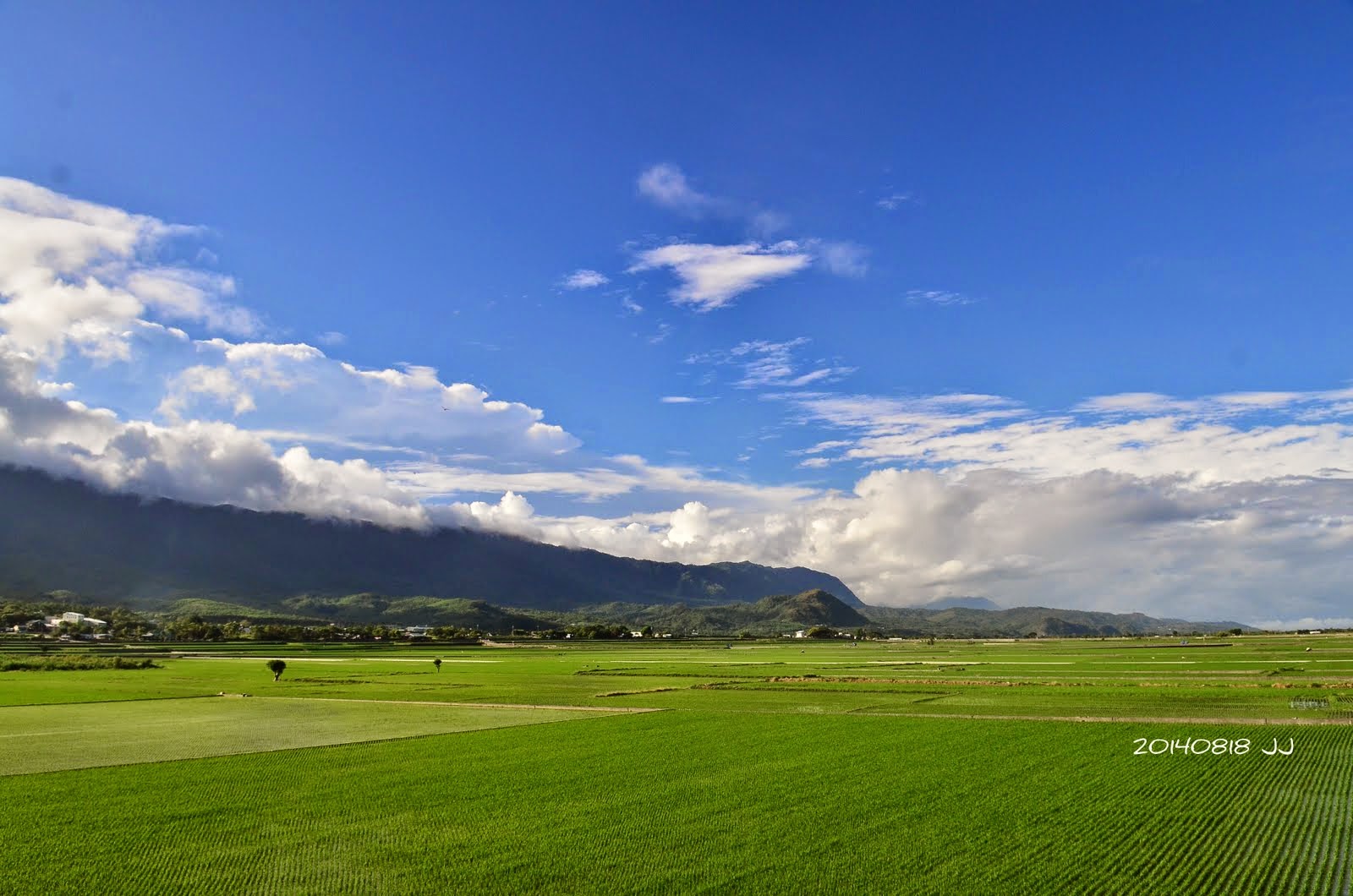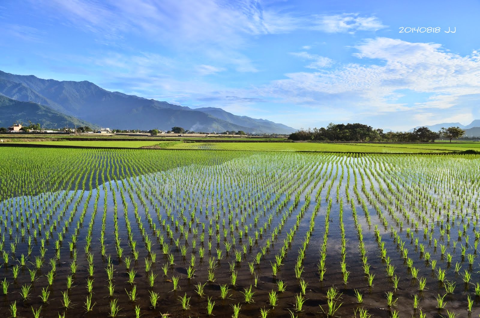 剛插秧的三期稻作,疏落的綠線透著山光水色,
