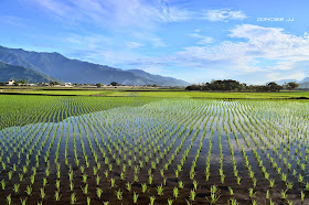 剛插秧的三期稻作,疏落的綠線透著山光水色,