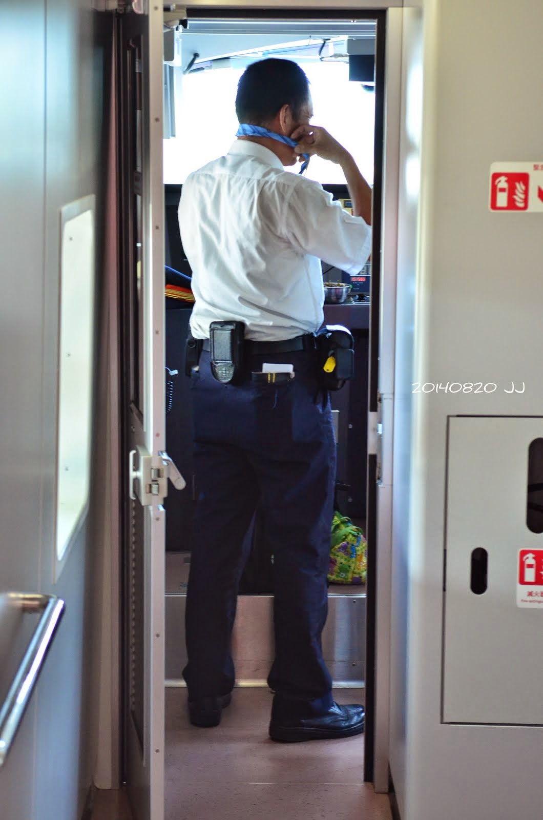 車長正在梳妝打領帶,準備上工。