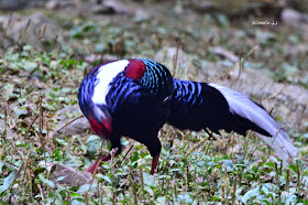 一群藍腹鷴就在路旁的草地啄食,無視於對面的眾鳥友。