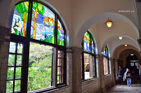 浴池由圓拱列柱圍起,搭配牆上的鑲嵌彩色玻璃,