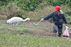 老農撈到好吃的食物就轉身餵小白鶴,