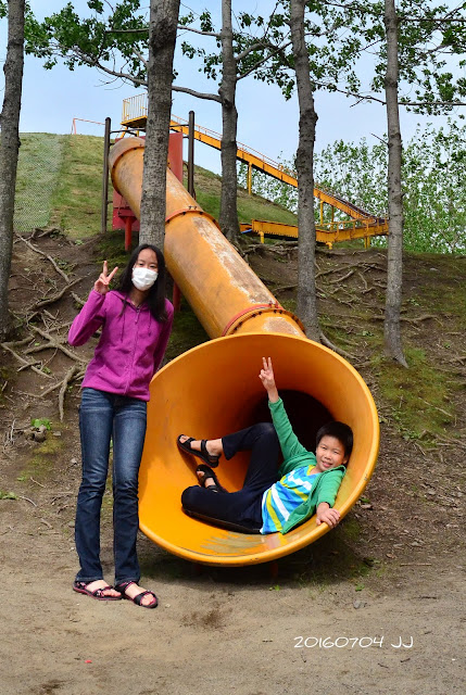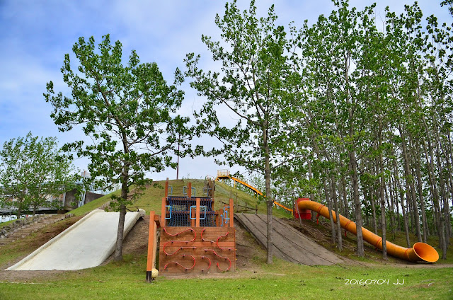 溜滑梯就在山丘上,看起來非常刺激,