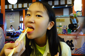 請女兒夾一片鮭魚讓我拍照,