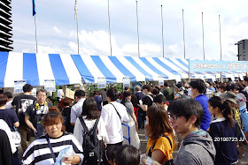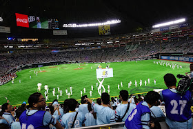 球場週邊滿滿的球迷要離場,長長的水藍色大軍,