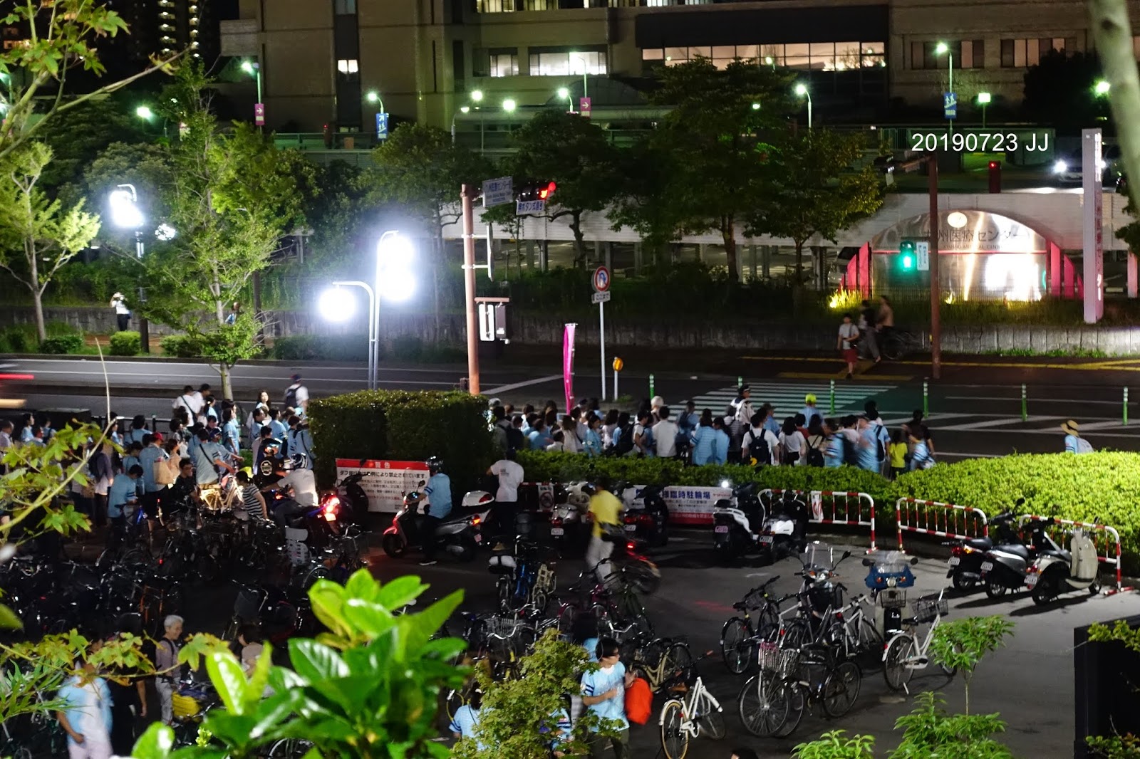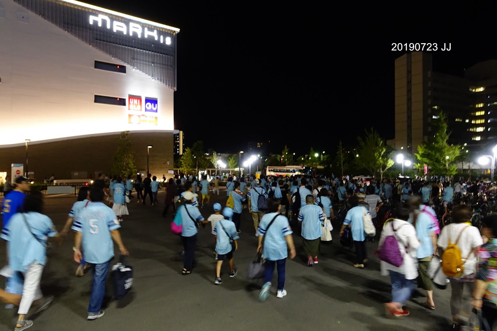 球場週邊滿滿的球迷要離場,長長的水藍色大軍,